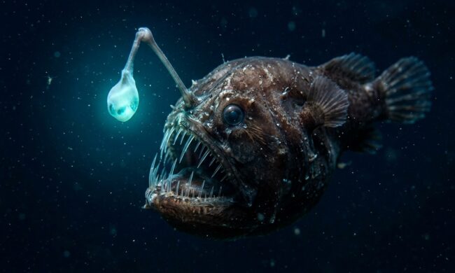 The anglerfish doesn’t produce light by itself. Inside its lure live special bacteria that are capable of producing light. The fish provides them with “housing” and nutrients, and in return receives a constant source of luminescence. This is a classic example of symbiosis — a mutually beneficial coexistence of two completely different organisms.