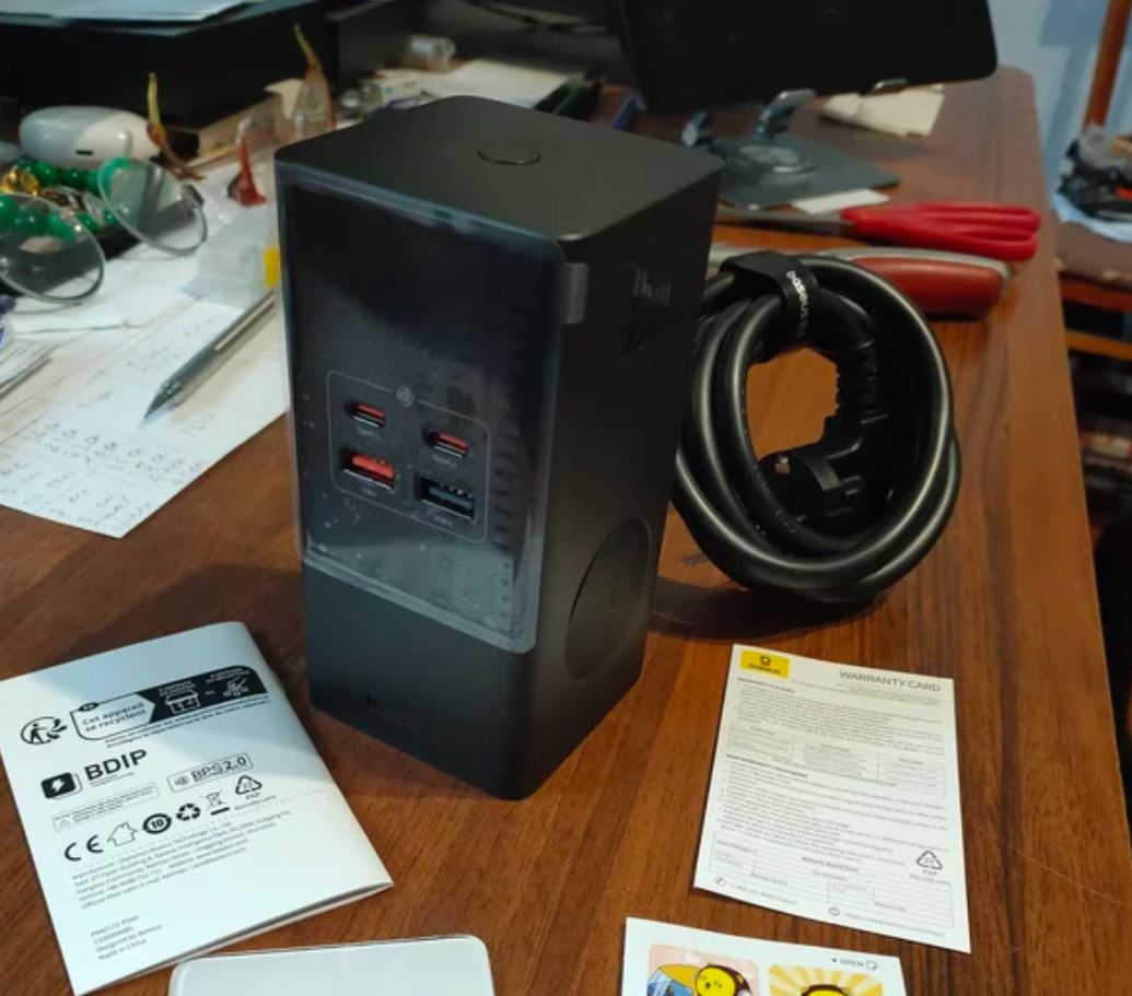 And here’s another item that dropped in price thanks to the sale — the Baseus desktop charger. It used to cost a fortune, and now it’s priced like a regular phone adapter. What we’re offered is a substantial unit with a display, power outlets, and USB ports. Like an extension cord, only more convenient. Plug in and charge everything at once!